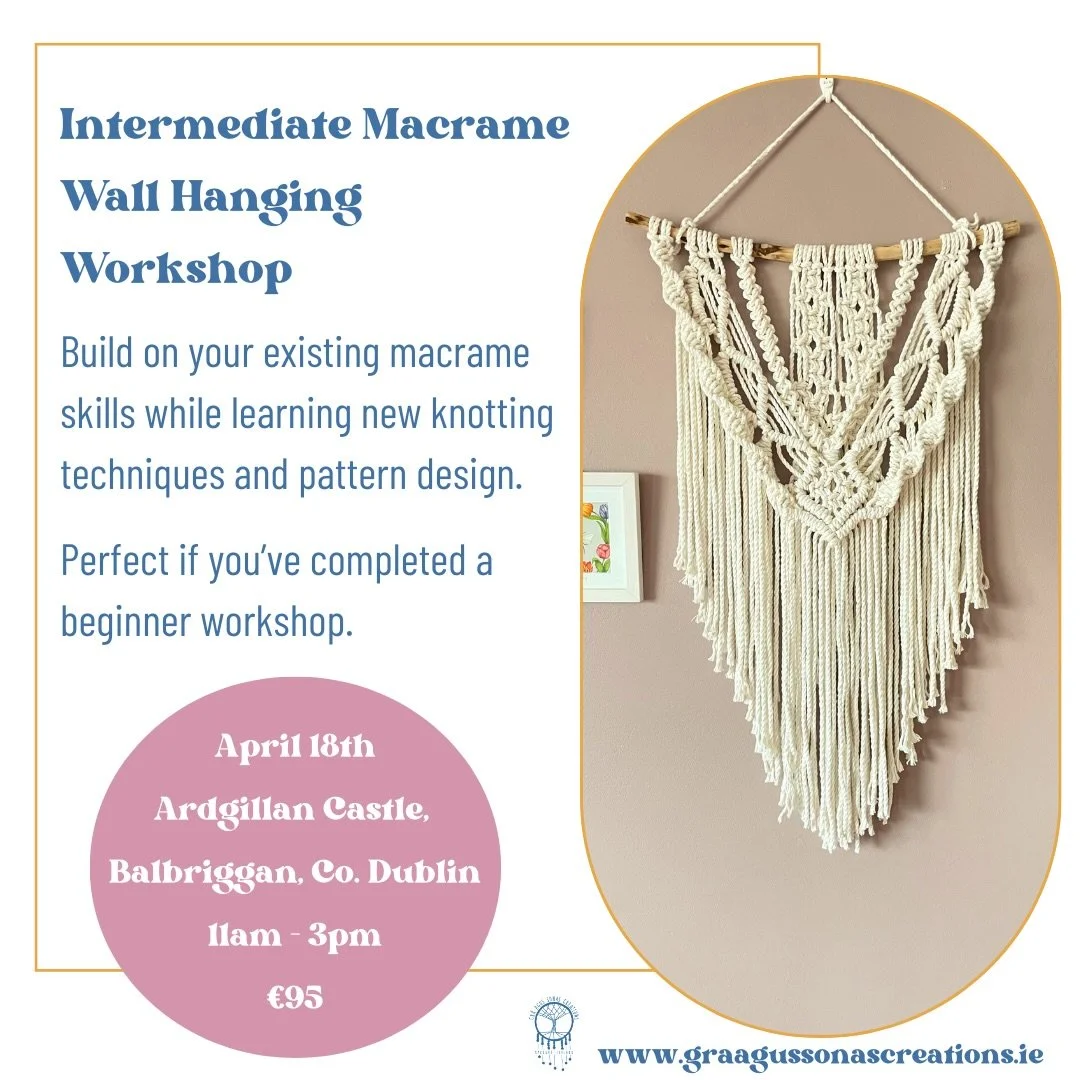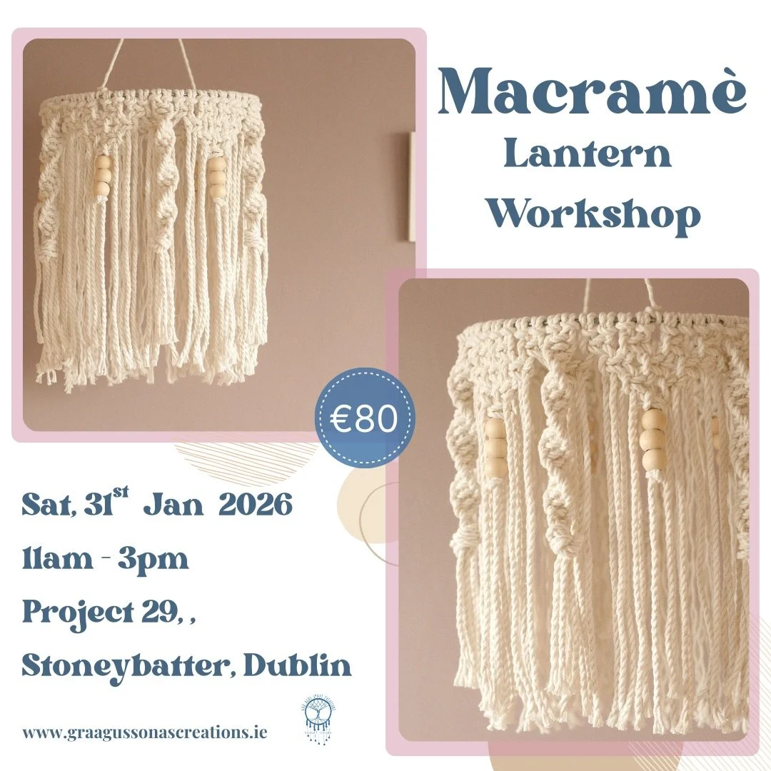 Grá Agus Sonas Creations was founded by Christina. Who has a passion for all things macrame. Christina is based in the beautiful seaside town of Rush, Co. Dublin, Ireland where she creates all her macrame wall hangings, macrame plant hangers and macrame accessories.